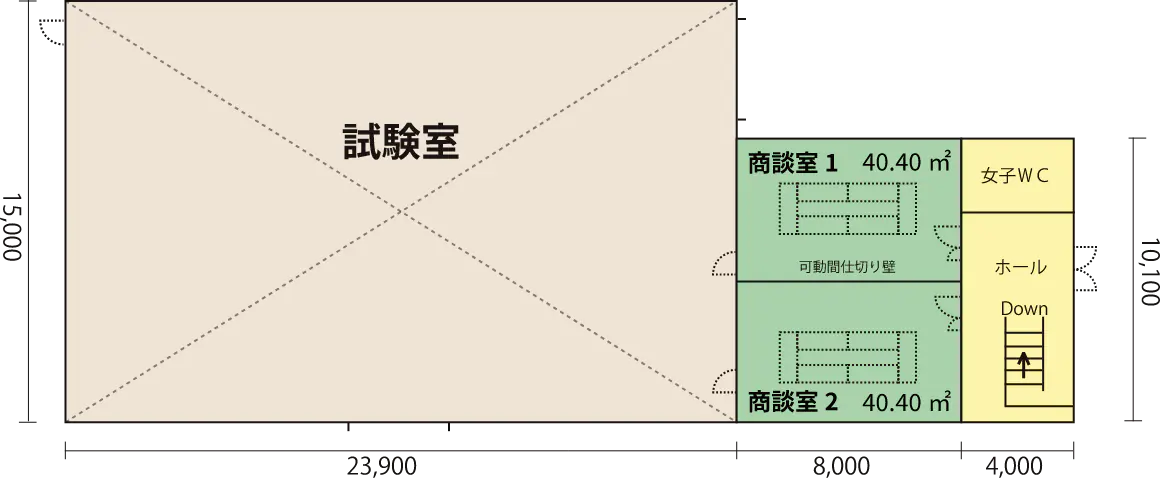 2F には可動式のパーテーションによる、商談室を用意しました。商談室をつなげ、最大40名(80.80㎡)のスペースがご用意できます。 さらに、別棟の多目的ホールでは100名以上のご利用も可能です。研修などに幅広くご活用ください。