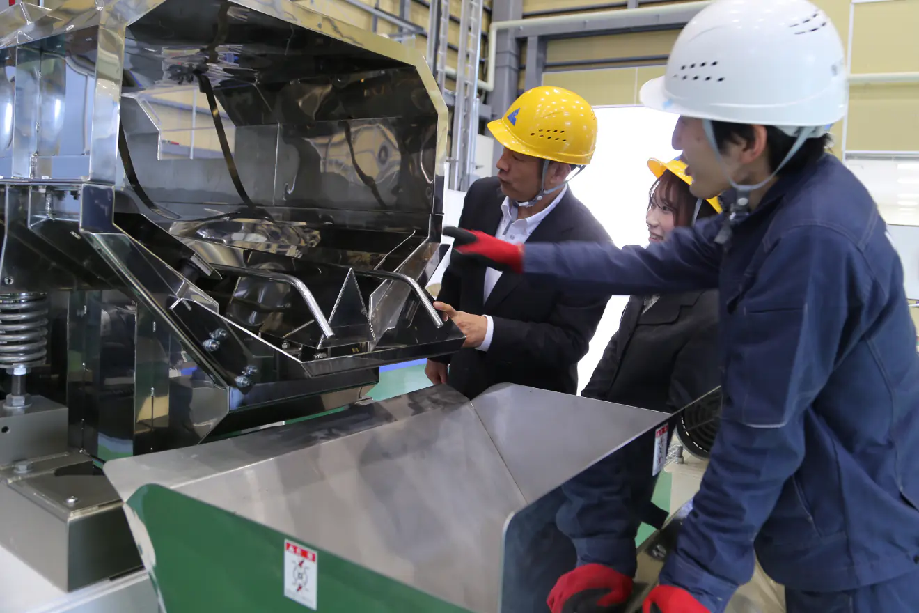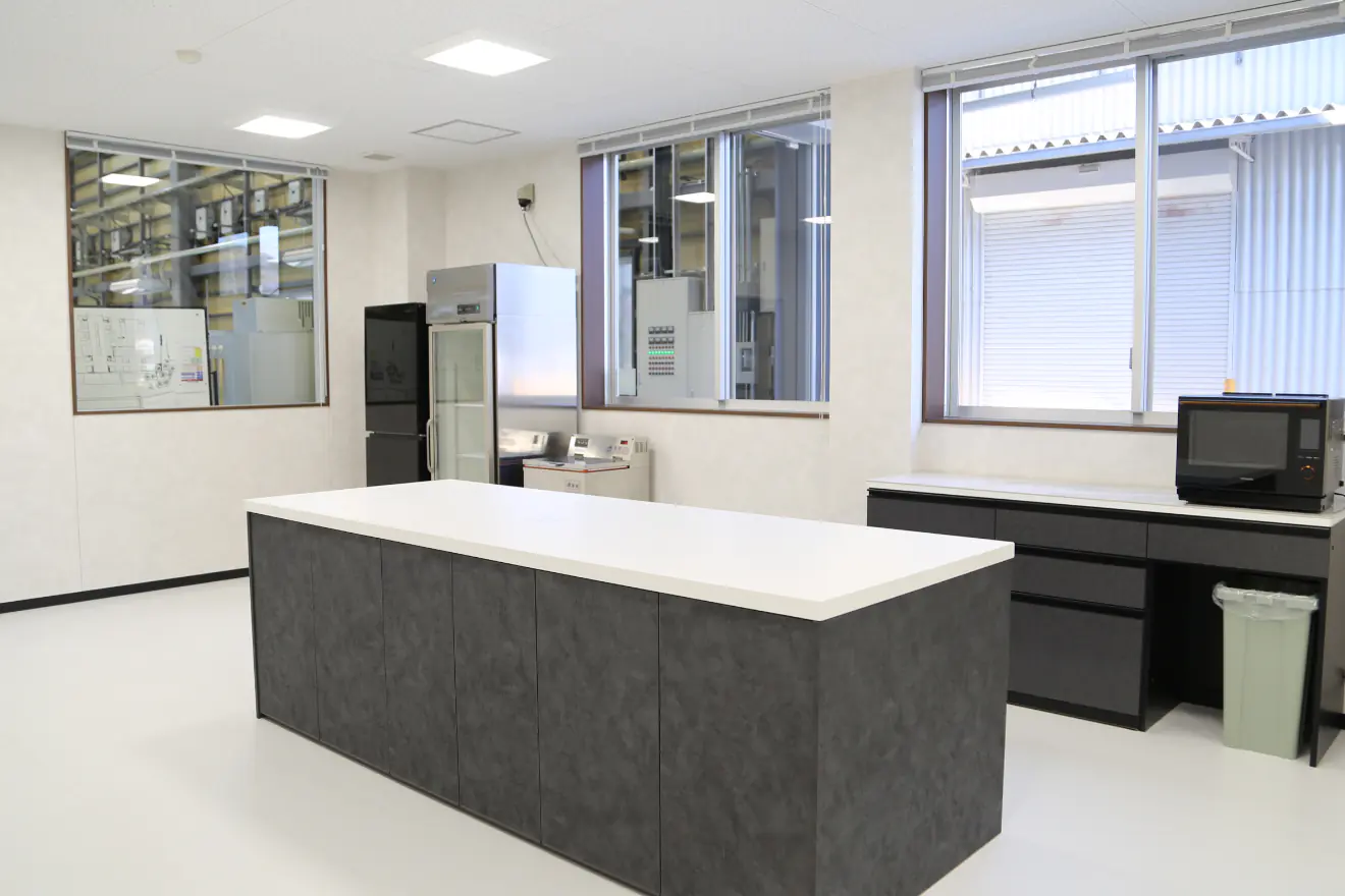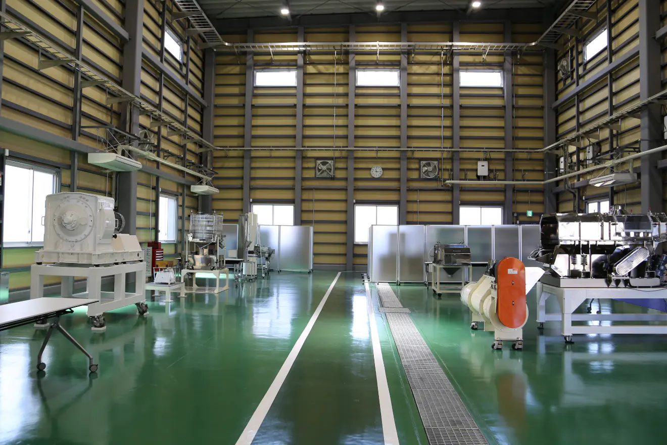 1 階は主にテスト実施のためのエリアとなります。原料受入れから、製品出荷まで実機をラインナップして、単体機械のみならず前後の工程を含めた検証が可能です。 分析機器も最先端の設備を用意しました。 また、食品加工を行うお客様のため、キッチンを併設しており、食品試作も可能となっております。